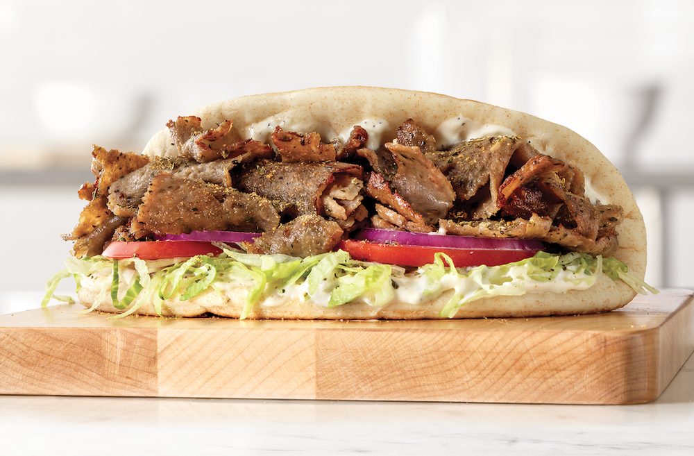 Thinly sliced roast beef with Greek Seasonings, cool creamy tzatziki sauce, lettuce, tomato and red onion in a warm pita. Visit arbys.com for nutritional and allergen information.